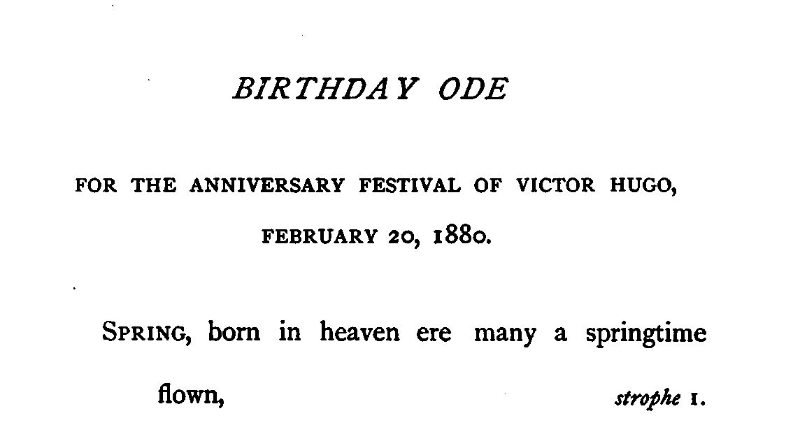 Dedications are another type of paratext discussed by Genette and a common feature of traditional literary texts. Again we draw examples from Swinburne. In the first case we see the dedication to the painter Edward Burne Jones, a close friend of Swinburne. The dedication is from Swinburne’s most famous volume, Poems and Ballads (1866). A second example is an implied dedication to one of Swinburne’s literary heroes, Victor Hugo, on the occasion of Hugo’s 78th birthday.